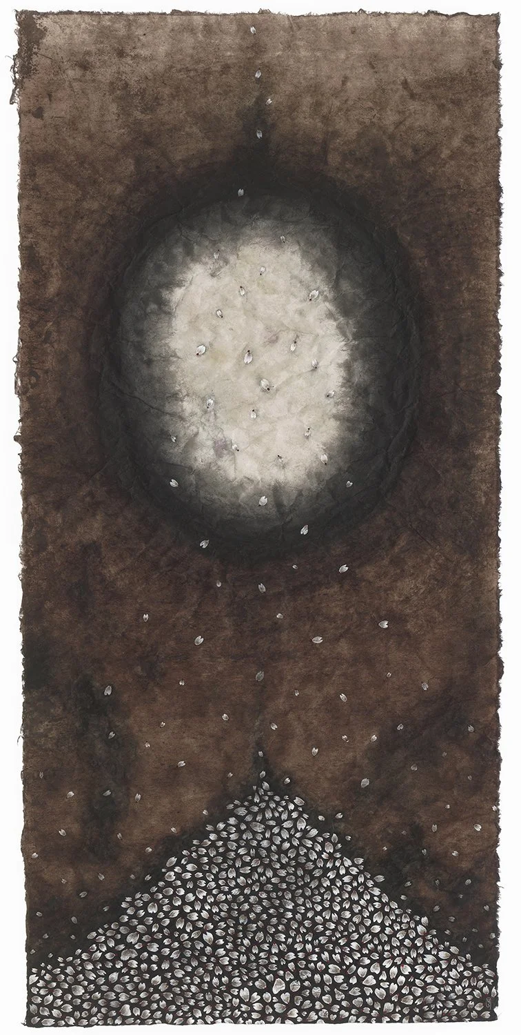 Pigment from melted guns, handmade ink from Mica and other foraged elements, Graphite, Willow Charcoal, Sumi ink, and Japanese Watercolors on Washi Japanese paper (Kozo Kurotani Gasenshi)