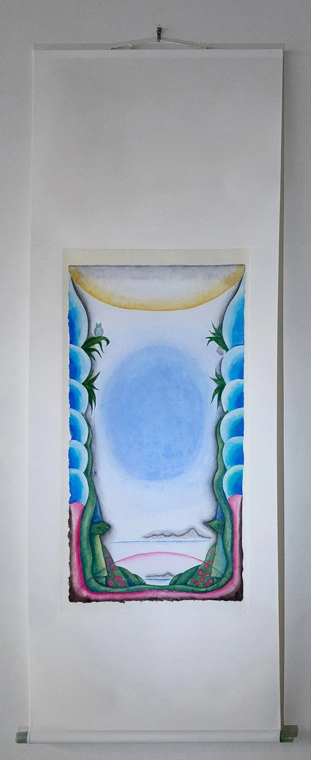Handmade ink from mica, Rudy Blue (dog’s blood serum) and other foraged elements, pigment from prehistoric volcanic dust, graphite, willow charcoal, sumi ink and Japanese watercolors on washi Japanese paper (Kozo Kurotani Gasenshi)