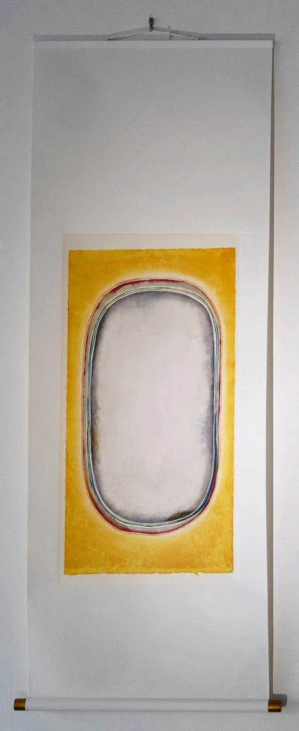 Scroll materials: Torinoko paper and cotton fabric for scroll mounting, cashew lacquered wood for the rod, and cupro strings.